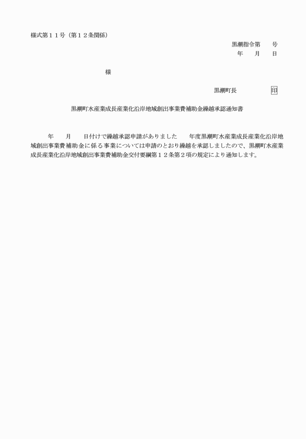 第12条 補助事業者は、補助事業が年度内に完了し難いと認められ、事業を翌年度に繰り越す必要がある場合は、黒潮町水産業成長産業化沿岸地域創出事業繰越承認申請書(様式第10号)により申請し、町長の承認を受けなければならない。