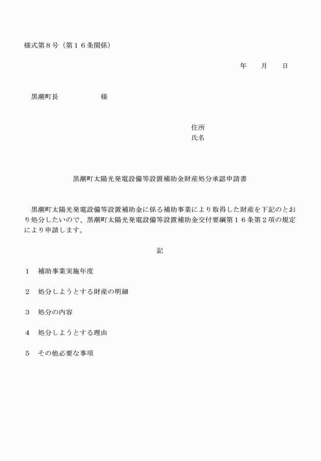 第7条 補助金の交付を受けようとする補助事業者は、町長が別に定める補助金の申請期間に、黒潮町太陽光発電設備等設置補助金交付申請書(様式第1号)に関係書類を添えて町長に申請しなければならない。