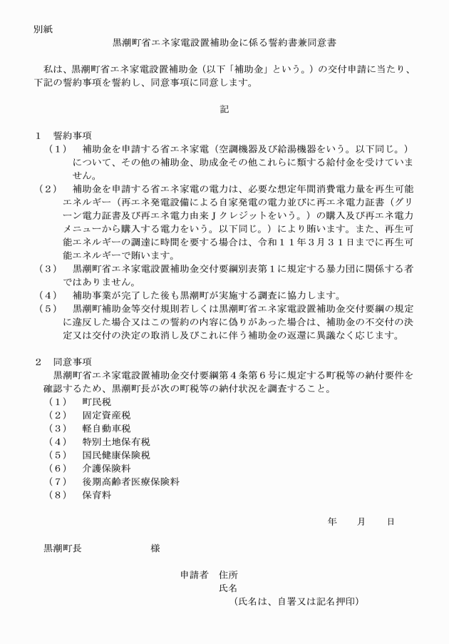 第1条 この告示は、黒潮町補助金等交付規則(平成18年黒潮町規則第46号。以下「規則」という。)第20条の規定に基づき、黒潮町省エネ家電設置補助金(以下「補助金」という。)の交付に関し必要な事項を定める。